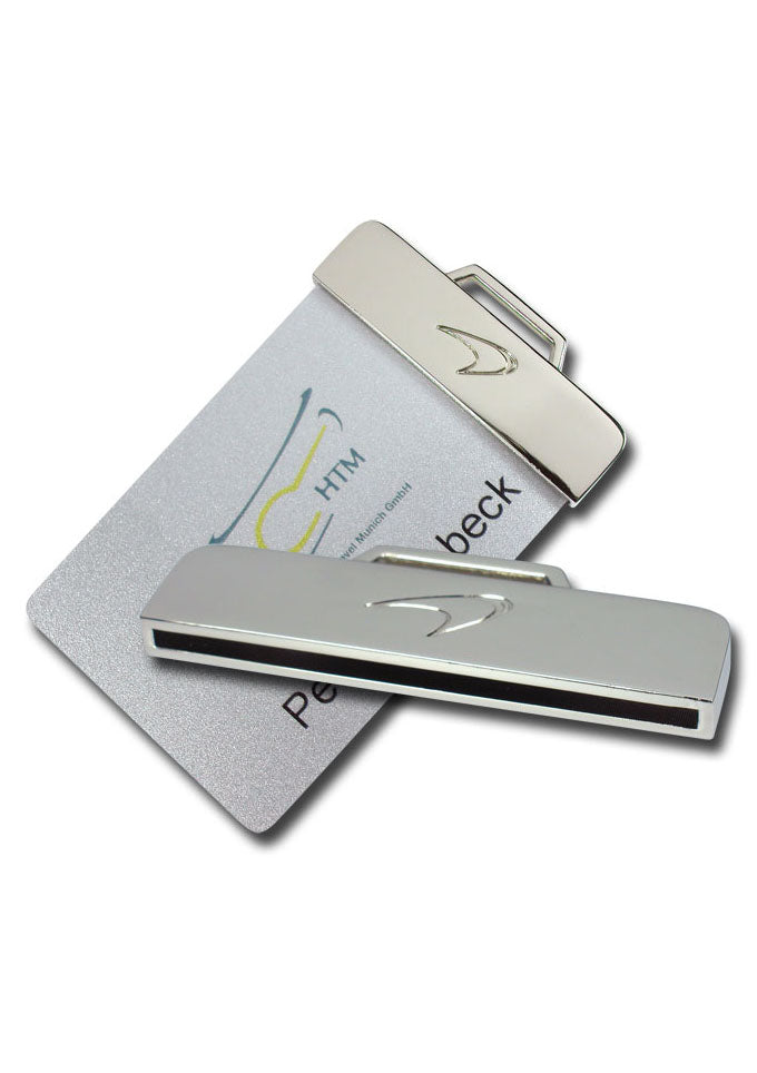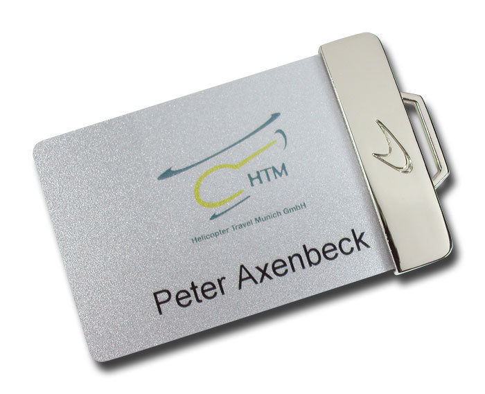 - Kartenhalter aus Metall, silber glänzend, mit Befestigungsbügel.
